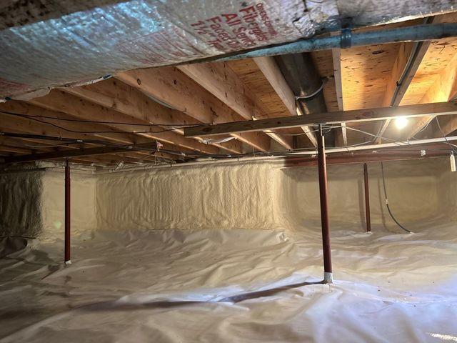 Clean Space covers the floors and runs up the crawl space walls as a moisture barrier. Spray Foam insulation was applied over it to insulate the walls and air-seal the rim joists.