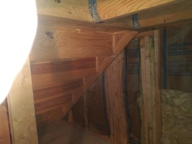 Underneath the stairs is where the mildew smell was the worst. The production crew removed all of this contaminated insulation and properly disposed of it.